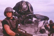 As the tower started creating storms, Johnny praised Geo for his work and they continued holding the line. After a while, Lost Patrol expressed their annoyance that the Federation was not aware of what was going on. However, Carmen told them that everything they had been doing had been broadcasted ever since the transmission to Amy Snapp. Emboldened by this, Johnny and the Lost Patrol managed to hold off the Bugs long enough for Geo to finish turning the Tower on. Johnny told One-oh-One to blow the bridge before they retreated inside to get out of there. However, Dutch was killed by a Bug, ripping him in half, to his disbelief just the same in the simulation. Unable to fully mourn him, they headed inside and started climbing the tower, fighting off a swarms of Warrior Bugs as they went up. It was then that Carmen radioed Johnny that she was coming down to pick them up, though she was having difficulty due to the storm. Johnny told her to get close to the scaffolding and to open the back of the dropship. She complied and the Lost Patrol were able to escape just as the Tower began to overload, utterly blowing the marching Bugs into so many pieces.